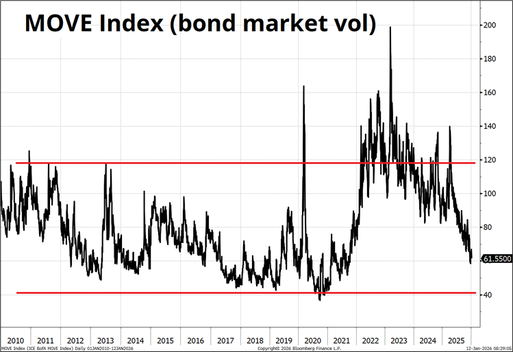 One of the more interesting (or perhaps uninteresting!) features of interest rate markets right now is the lack of movement priced in for central banks in 2026. Two cuts from the Fed, one cut from the Bank of England, zero from the Bank of Canada, ECB, and SNB, and one hike from the RBA is all we’ve got. While this partially explains moribund fixed income volatility, it’s worth noting that we are still above the MOVE Index lows seen in 2017, 2018, 2019, and 2020. The pre-COVID range for MOVE was 40-120 and we are currently plumbing 61.
