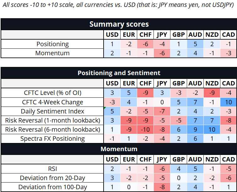 Hi. Welcome to this week’s report. The CFTC data has finally caught up, so this data should be on target again. The USD shorts disappeared pretty quick as short CHF and short JPY offset the long AUD position to yield a net close to flat or a big AUDJPY long, depending on how you slice and dice it. Note below that there are some large strikes coming off this Friday.