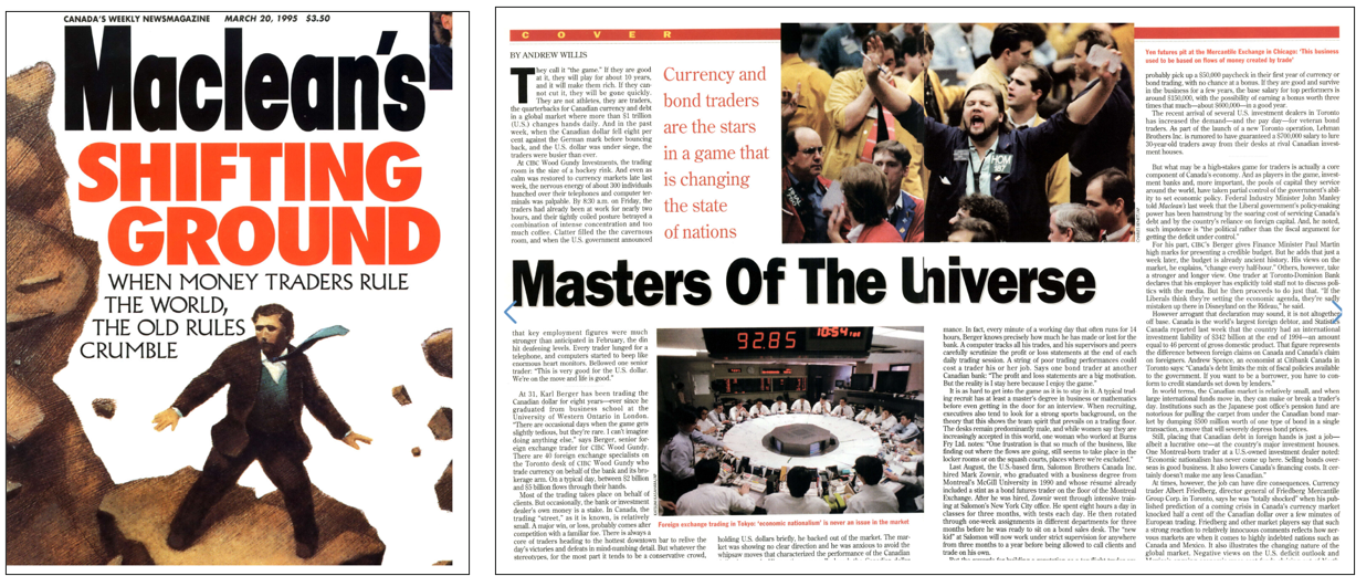 You know when FX trading was cool? 1995! Right after I got hired, there was a cover story about FX traders in Canada’s National News Magazine, Macleans. The spread headline was “Masters of the Universe.” This morning, I went through that back issue from March 1995 and it I will say: Going through old magazines like this really gives you a sense of how things never really change. For example, here is one of the lead articles, which echoes the current and forever-ongoing angst over DEI. This is from 1995!