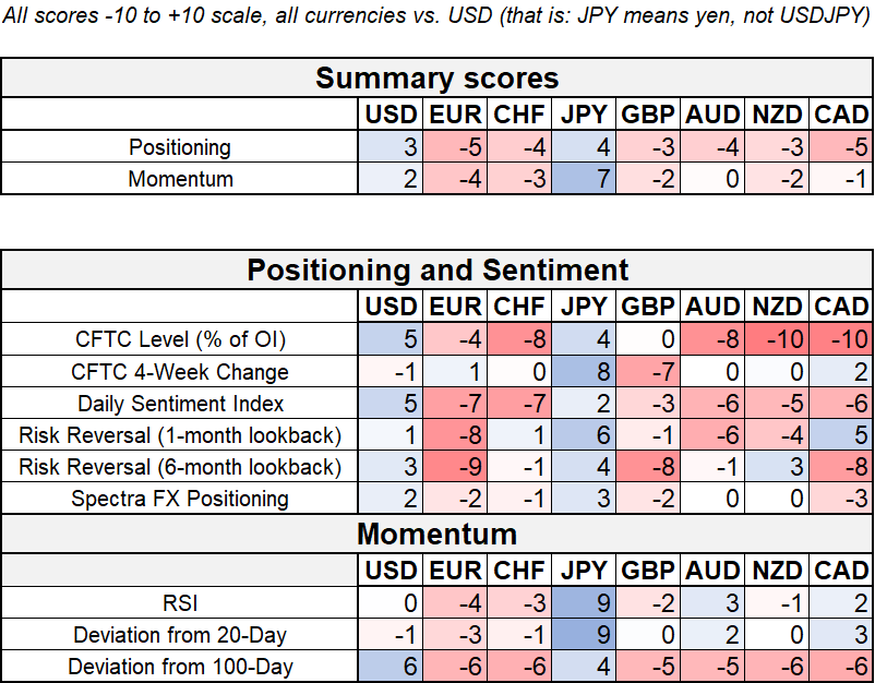 Hi. Welcome to this week’s report. USD positioning continues to come off the boil as the zone has been flooded with so many tariff headlines that nobody knows what is real and what is not. There have also been some stories circulating that would be incredibly dollar bearish (revaluing gold reserves and/or terming out debt) and these, along with the passage of time and flat USD momentum, have reduced the excitement around long USD trades.
