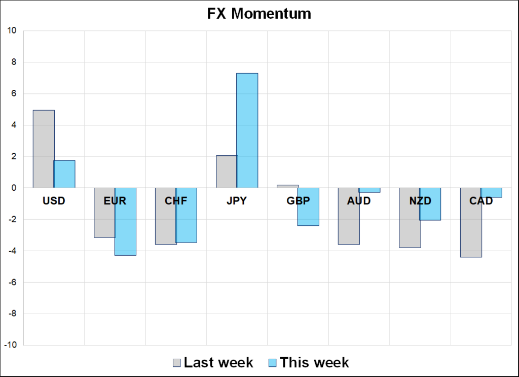 The biggest week over week change comes in JPY momentum as the dip in US yields and USDJPY’s status as the “only safe USD short” have attracted some interest in JPY calls vs. USD, CHF, CAD, and EUR. This is most-easily seen in the USDJPY risk reversal. It started the year around -1.2 (for USD puts), got all the way up to minus 0.75 and has now trended down to -1.44.