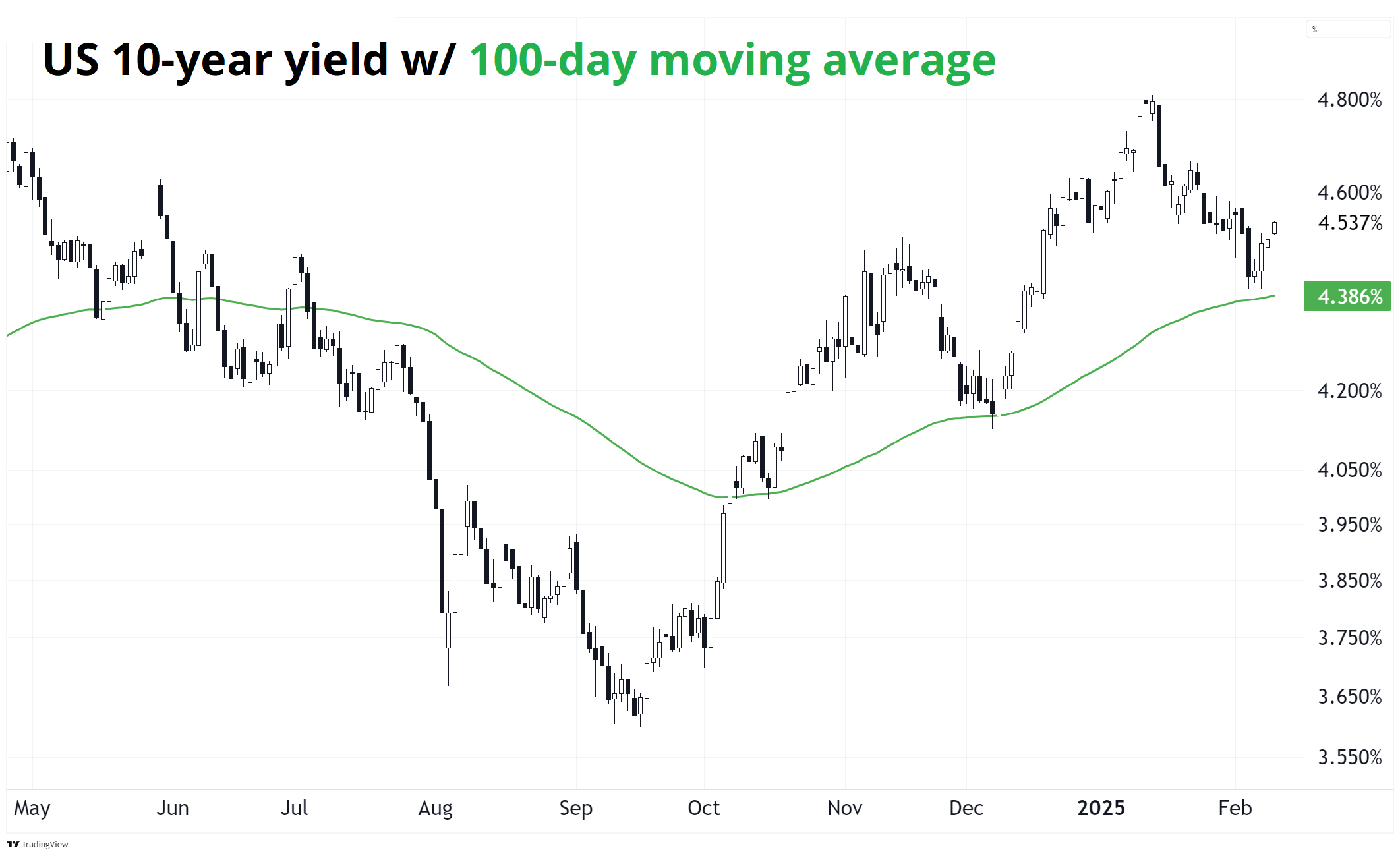 The expected value of front-running the Mar-a-Lago Accord is super negative while the expected value of selling the USD lower gap on the news is strongly positive. Moving right along… The attempt lower in yields pre/post payrolls stopped right at the 100-day moving average.