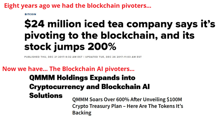OK. And remember when Long Island Iced Tea and Kodak pivoted to the blockchain in 2017 and saw their stocks rally 200%? And remember the SPAC bubble in 2021 or the NFT bubble in 2022? Well, here we go again. Companies are now adding “Blockchain AI” or SOL or ETH to their business plan and watching their stock rally 300%.