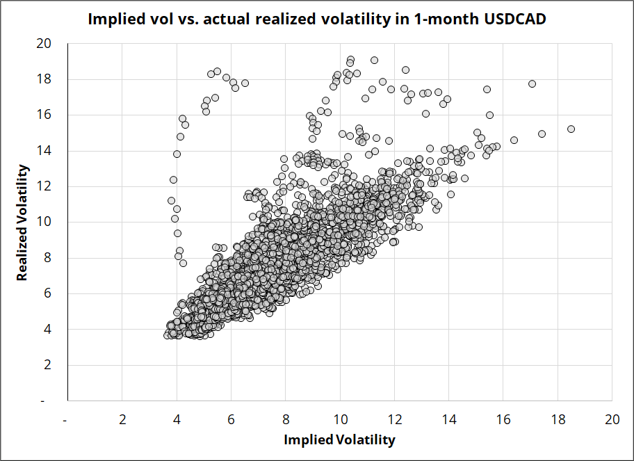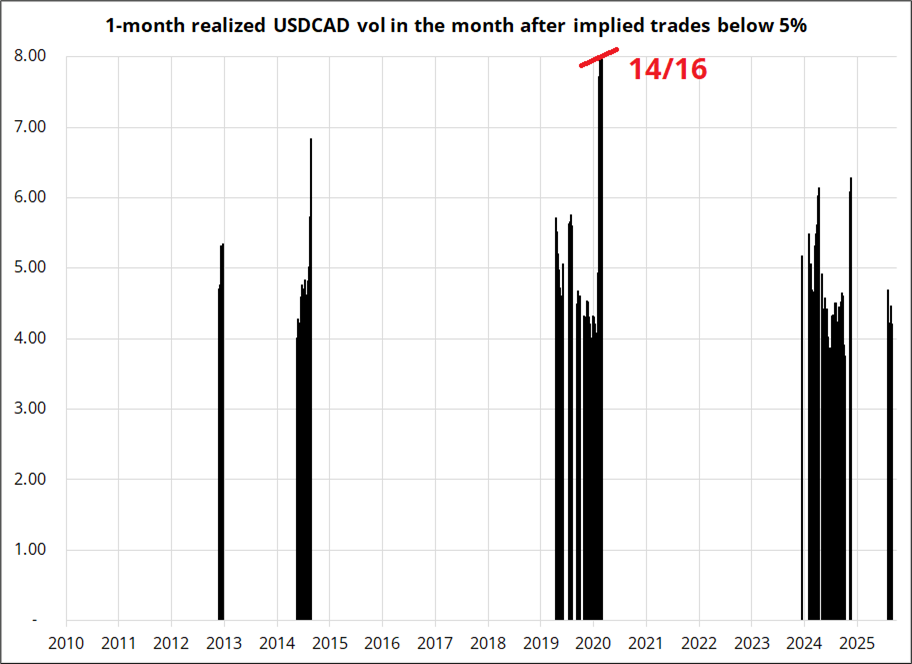 Directional bets can find great leverage in vol environments like this, but there is no promise that low implied vols will actually realize. I took a look at all the times that USDCAD implied vol was trading below 5% and then checked the actual (realized) vol in the month that followed.