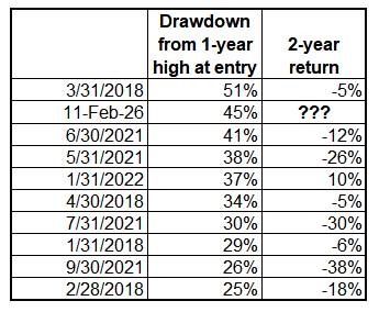 Bitcoin goes nowhere for two years. Dead money. This might seem hard to believe given we’re already 40% off the highs. But it has happened before. If you bought the first pullback in 2018 or 2021, you still lost money or broke even over the following two years. The data, using monthly closes: