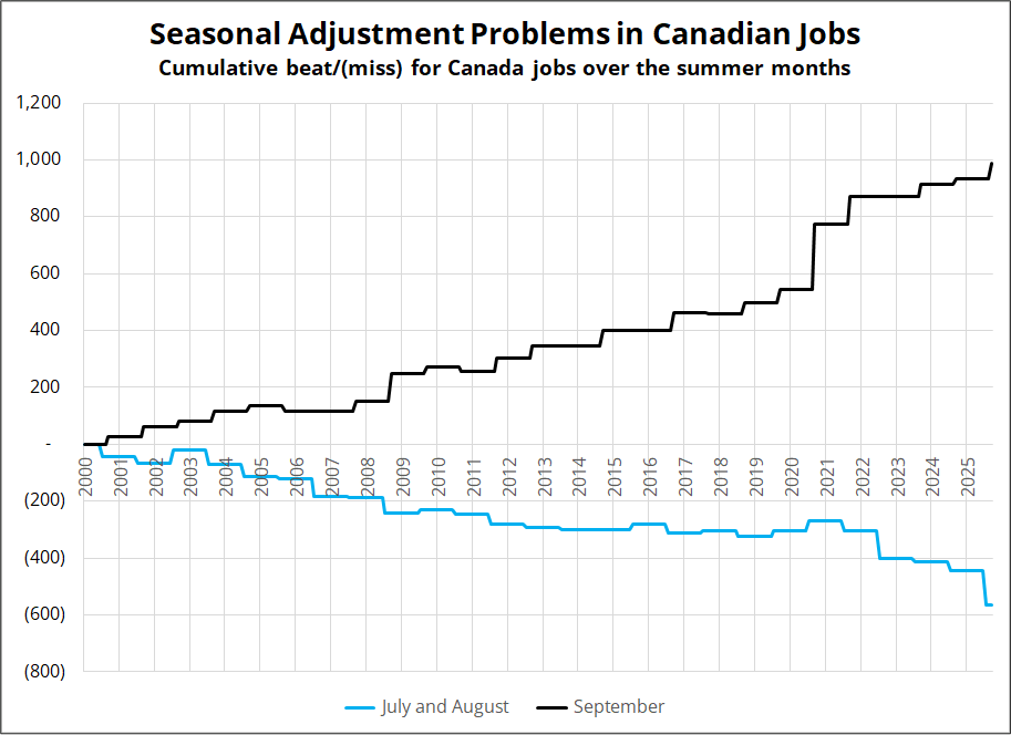 I still like a weaker CAD, despite Friday’s stonking jobs number, as September jobs data in Canada tends to have a ton of seasonal adjustment issues. StatsCan doesn’t adjust properly for the movement of teachers in and out of the workforce. 23 of the past 26 September jobs releases have been strong.