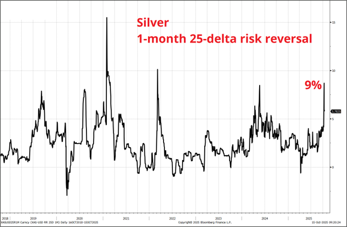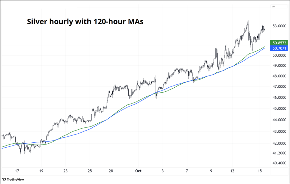 - The silver 25-delta risky got back to levels where it topped in the past. At the risk of being annoying, I still think this is a bubblette and we see 46 before 56. The 5-day MAs come in around 50.70/50.85, so that’s the zone to watch if you are assessing its short-term trend.