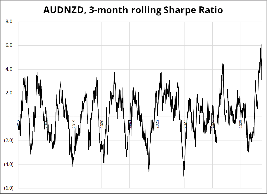 If you’re wondering about FX, USDCAD’s Sharpe has been above 2.0 over the past three months, and AUDNZD got as high as 6.0 before two violent corrections. First, on the 100% China tariff “news” and second on last night’s Aussie jobs data. The Australian data was modestly on the weak side, with the UR ticking up two tenths, and the market is getting a bit tired / bored of a profitable position that has been working well since the dovish RBNZ on August 19.