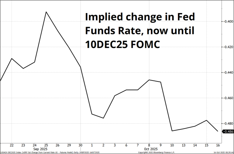 With two full cuts now priced for the Fed (48bps implied, see chart) and questions remaining about whether or not inflation is picking up, my guess is that the USD will run higher into the October 24 CPI print as there is very little room for Fed pricing to go more dovish for 2025 and there is some possibility December gets partially priced out on a strong release.