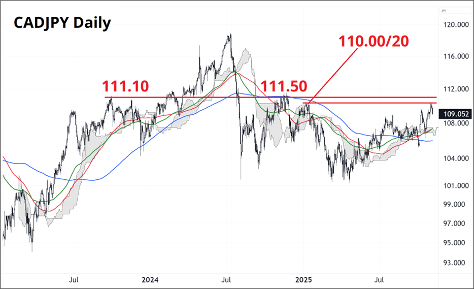 The chart here shows how 110.00/20 and 111.00/50 have been mega resistance in CADJPY over the past two years. If you think ADP will be weak, sell CADJPY here (109.05) with a stop loss at 110.61. Or buy 2-week 108.00s.
