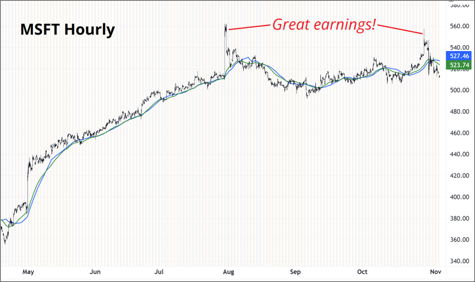 There is a growing pattern where these explosions higher are rejected. MSFT has also made a near-perfect double top with each high the result of a rejected spike on blockbuster earnings.