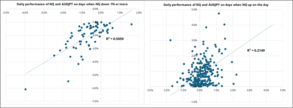 For example, look at the relationship between AUDJPY and QQQ under two conditions. The chart on the left shows all days since January 2024 where NASDAQ futures (NQ) were down 1% or more. There are few days where AUDJPY went higher and the r-squared is 50.6%. In contrast, in times of calm, when NQ is up on the day, the r-squared drops to 21.5% and the AUDJPY performance is all over the place.