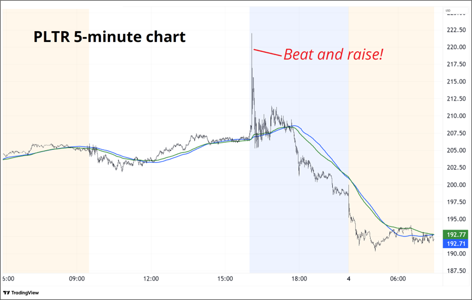 Last week, in am/FX: BOJ and stocks, I wrote about the growing number of yellow flags in stocks and reasons to short ORCL, CRWV, and NVDA with an emphasis on ORCL. The thesis was that weak crypto, the poor response to META’s capex increases, and a more hawkish Fed could put downward pressure on the megatech trade. You can add last night’s price action in PLTR on a beat and raise: