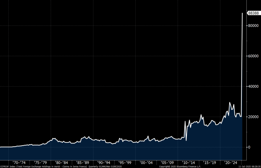 The Q1 COFER data came out. It shows the changes in central bank holdings of various currencies and this quarter’s report showed a strange and impossible-to-believe jump in CHF holdings by central banks. This will be discussed for a while, but my feeling is that the data is wrong. No way someone bought 60 yards of CHF in a quarter where USDCHF went from 0.9000 to 0.8840.