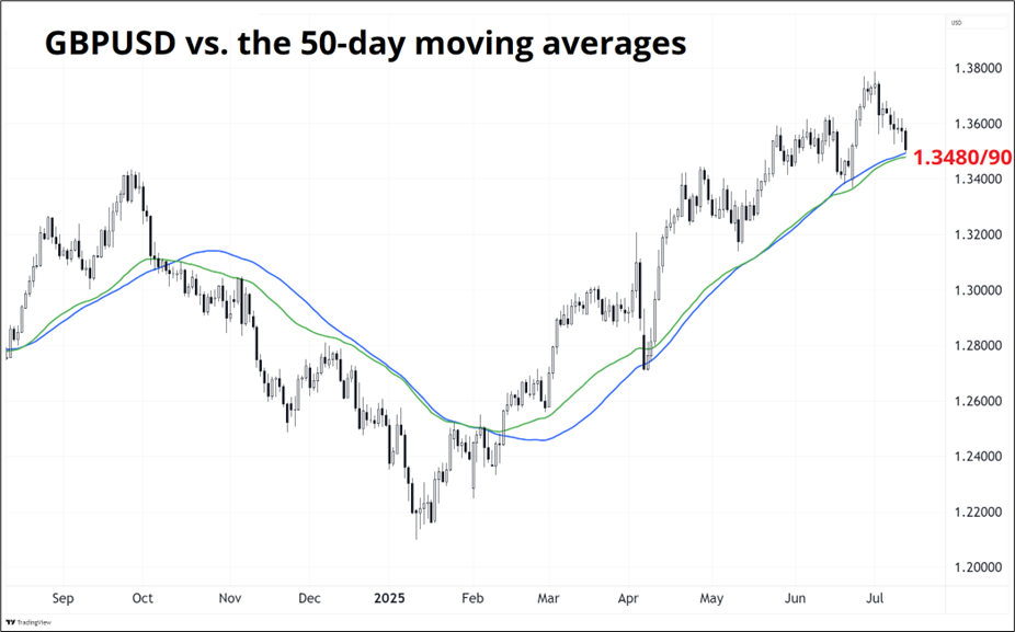 You can see in this chart that GBPUSD is nearing its 50-day moving averages (simple and EMA on the chart) and these have been perfectly defining the trend up (much as they perfectly defined the prior trend down). So a daily close below 1.3480 should open up some downside and trigger a spike in bearish interest.