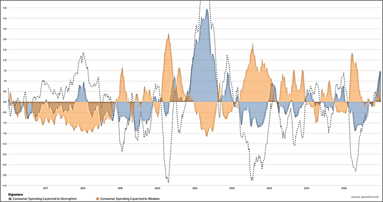 This is an investable signal to me for two reasons. First, this is the highest reading for the “consumer spending is expected to strengthen” narrative since 2021 when we were coming out of Covid, and the trough to current peak move here since April 2025 is pretty similar in scale to the trough to peak move in 2021. This is a big move, and stories about strengthening consumer spending (because of tax refunds or reduced withholding or whatever) are everywhere today. Moreover – and this the second reason I think this is an investable signal – this is all happening even as the other side of the argument, “consumer spending is expected to weaken”, is still pretty darn strong. Look at this chart and see how rare it is for both ‘strengthen’ and ‘weaken’ narratives to persist in positive form simultaneously, particularly at the beginning of a strengthening narrative cycle. These are narratives that are almost always mirror images of each other. There is rarely an argument in narrative-space about which way the consumer is going.