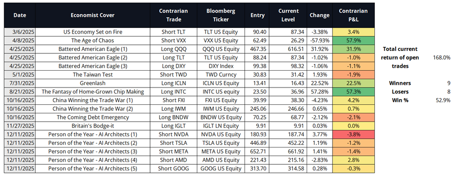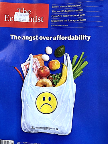 The second related item: The Economist Magazine published a cover on affordability that features a sad-face emoji. As you probably know, that particular magazine has an astonishing track record of marking turning points in major narratives. This was true when Greg Marks and I first backtested all covers 1997 to 2016, and it was true when I ran the study again in 2021 and found it had worked well, out of sample, for five years. And it has worked well out of sample 2022 to 2025, too. Full write up / explanation is here.