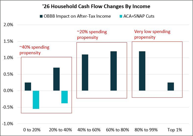 Third, Bob Elliott posted the following chart. It makes me wonder if maybe we are overestimating the stimulatory benefits of the OBBB as health care payments are about to blow higher, SNAP is forcing young adult applicants to navigate more red tape and benefit cuts, and wage garnishment for student loans restarts in January 2026. I am always biased to believe the steady state base case in the US, but I agree with Ben’s assessment that the market is not intellectually ready for a consumer slowdown right now. Much consumer spending positivity is priced in for H12026. The pushback against this chart could be that the low-end doesn’t matter because they don’t spend very much.