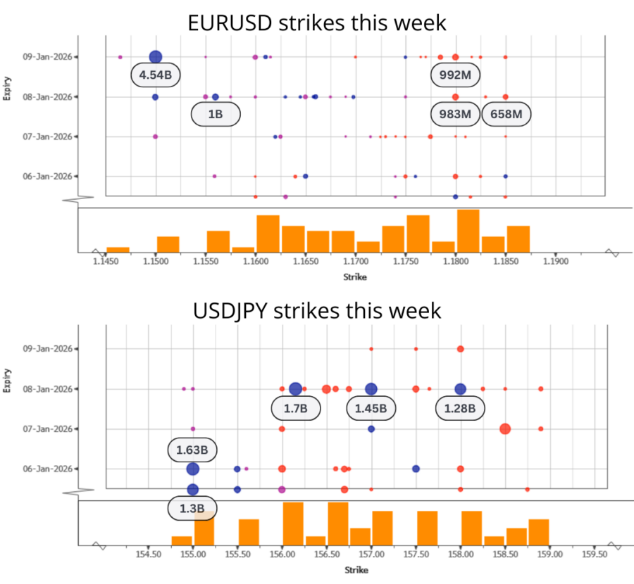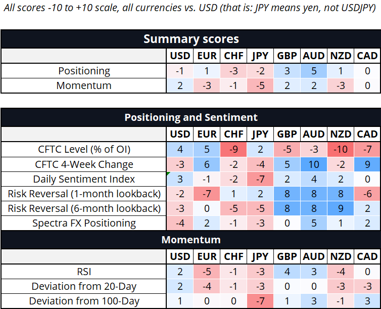 Hi. Welcome to this week’s report. The CFTC data has almost caught up (currently as of 23DEC25) and while our report shows the market tiny short USD, it’s worth mentioning that multiple bank positioning reports show much larger USD shorts than we do. I would guess that our report understates the USD short a bit because the big short CHF position is skewing things a bit and the USDJPY long is offsetting larger USD shorts in EUR and AUD. Big USDJPY strikes pre-NFP.