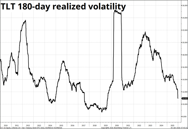 Finally: TLT is trading at $87.30. My guess would have been that the 15-delta call would be closer to 99/100, not 95. Bond vol is cheap! It’s cheap for a reason, though.