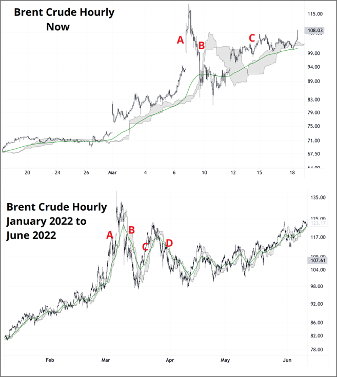 Many oil experts say this is a much worse situation for oil than the start of the Russia/Ukraine war in 2022. The price of Brent Crude could confirm this by making a new high. In 2022, the final Sunday gap was never broken.