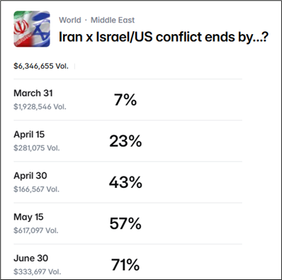 It’s interesting to see so much complacency in equities with so little chance of a resolution priced in to Polymarket. Either people are overhedged or they think FOMO risk is greater than any economic or supply chain or stagflation risk. Or both.