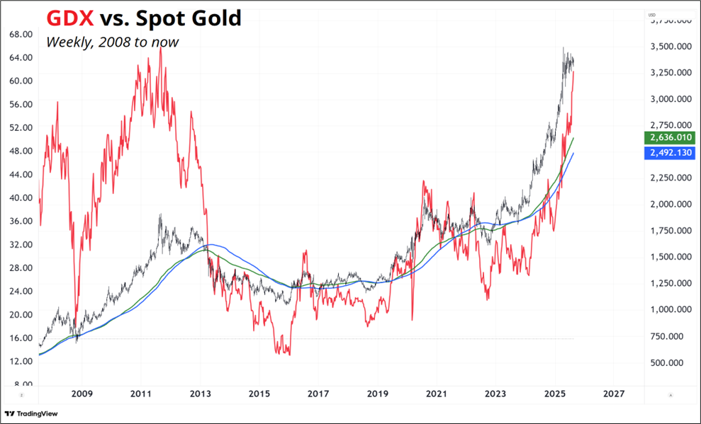 1. After 15 years of torture, GDX (the gold miner ETF) is almost back to 2011 levels. Very strong performance of late, even as spot gold consolidates.