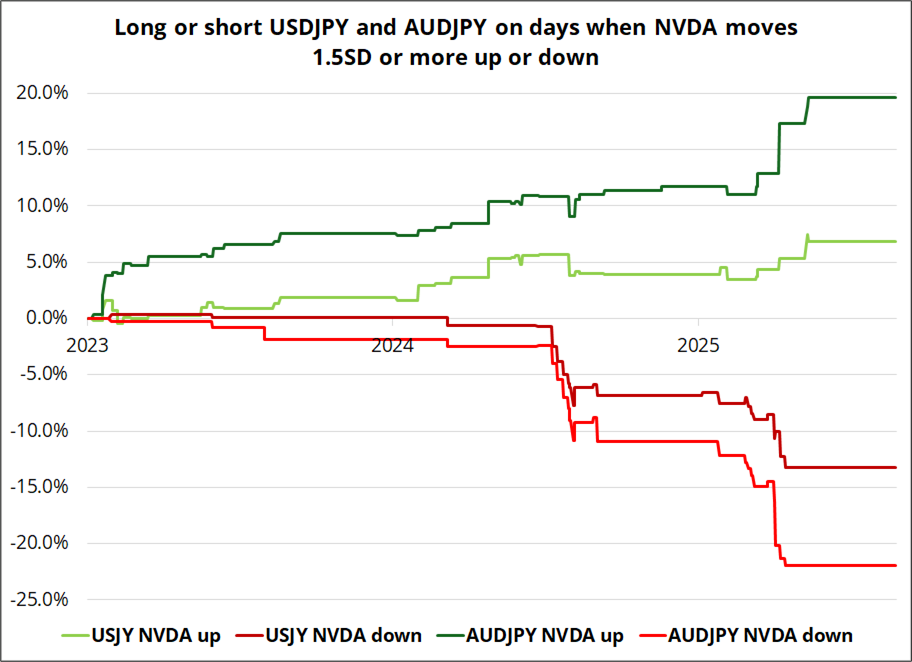 Another way to look at this is to simply filter for huge moves in NVDA and see how USDJPY and AUDJPY moved. This might be more useful than looking at a small sample of earnings releases because NVDA doesn’t always have a large move on earnings day. So, let’s see what USDJPY and AUDJPY do when NVDA has a 1.5-sigma move or more.