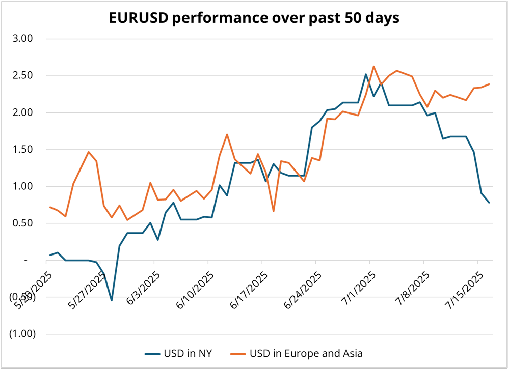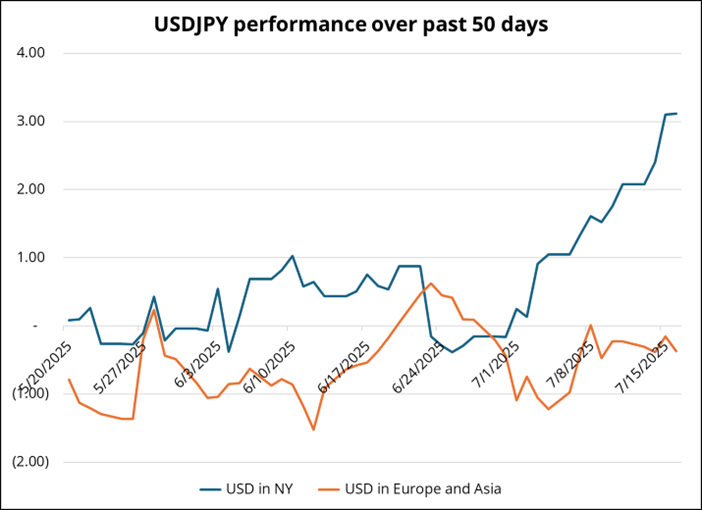 The NY time zone continues to buy USD as CTAs unwind USD shorts and the US data fails to offer any sort of cyclical reasoning for bearish USA views. Inflation data have been mixed with mildly worrisome CPI components and PPI weak with stonking upside revisions. USDJPY has been spicy, time-zone wise, as it has rallied in a straight line since July 1 and all this rallying has been in the NY time zone.