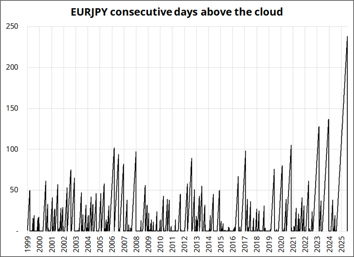 I continue to like EURJPY lower because I think that supply of USDJPY will remain solid even as the USD rebounds. I had highlighted the fact that EURJPY is now back in the cloud after spending ages above it. Here is a chart of number of consecutive days EURJPY is above the cloud. Unprecedented!