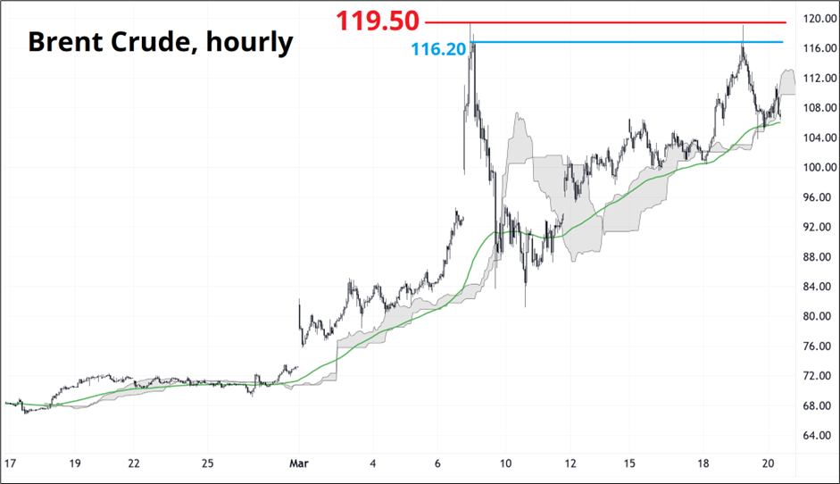 The Brent crude chart is interesting because when Russia went into Ukraine (again) in 2022, oil never took out the highs after the initial explosion. That is true now, too, as we have made a huge double top at 119.50 so far. If the experts are right and this is the biggest shutdown of oil capacity, ever, we are going to make new highs barring a rapid de-escalation. Problem is that de-escalation doesn’t guarantee how far energy prices will fall. There is permanent damage to some facilities, with LNG capacity in Qatar, for example, unlikely to come back to previous levels for years and reopening of Hormuz likely to take weeks or months.