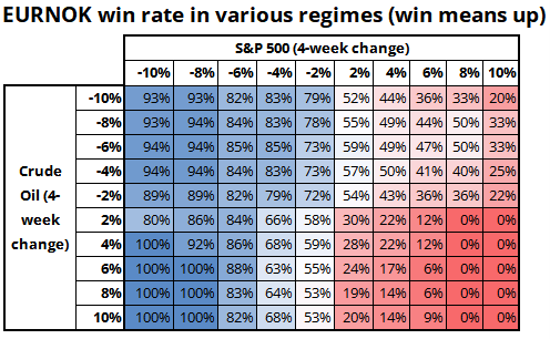 Nowhere is this regime-dependent disparity of performance more evident than EURNOK. While higher oil prices should benefit Norway, in theory, that’s not how currency markets behave. Hedging of Norwegian foreign asset holdings dominates if U.S. equities sell off hard. Here is a matrix showing four-week win% for EURNOK in various oil vs. SPX regime combos.