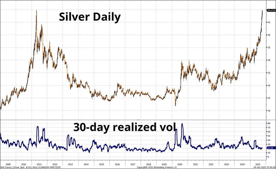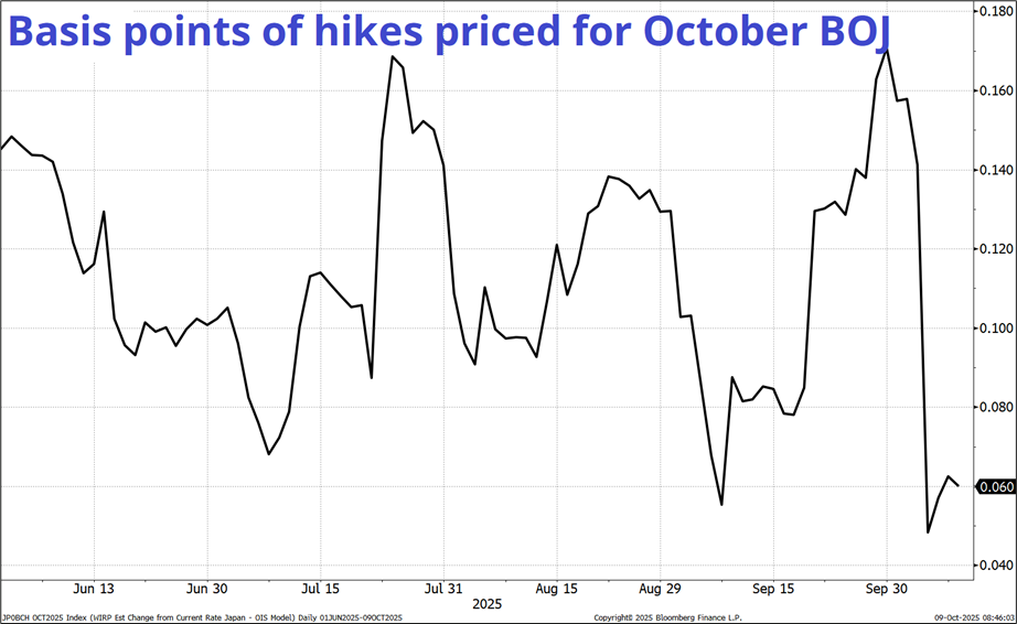 Here’s the evolution of October BOJ pricing. I did not feel the need to label the point where Takaichi won. While I don’t think the market has had much time to put on short yen trades, I suppose the risk now would be that if the BOJ hikes in October, that could put a dent in the spec fever elsewhere because Takaichi’s win put some extra wind in the sails of the debasement trade. XAG/JPY has almost doubled since April. Epic.
