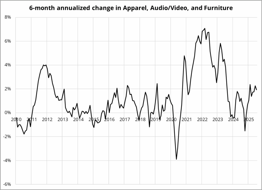 I looked at the 6-month annualized combined change in three tariff-sensitive sectors, and you can’t really see much of anything scary going on.