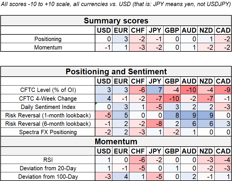 Hi. Welcome to this week’s report. Positioning remains tightly wound around the zero bound as few narratives are found and we remain rangebound and specs get clowned up and down. Dollar shorts have long since unwound post the July 1 turnaround and while the euro was newly crowned as the reserve currency most sound, even that story appears to have run aground. AUD isn’t cooked, but it’s been nicely browned. In the background, the CFTC is still short the pound, and the UK-negative narrative remains sound.